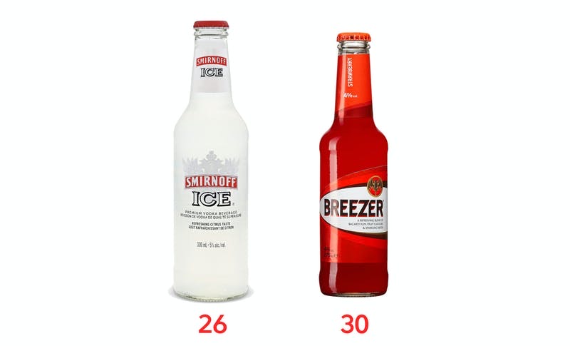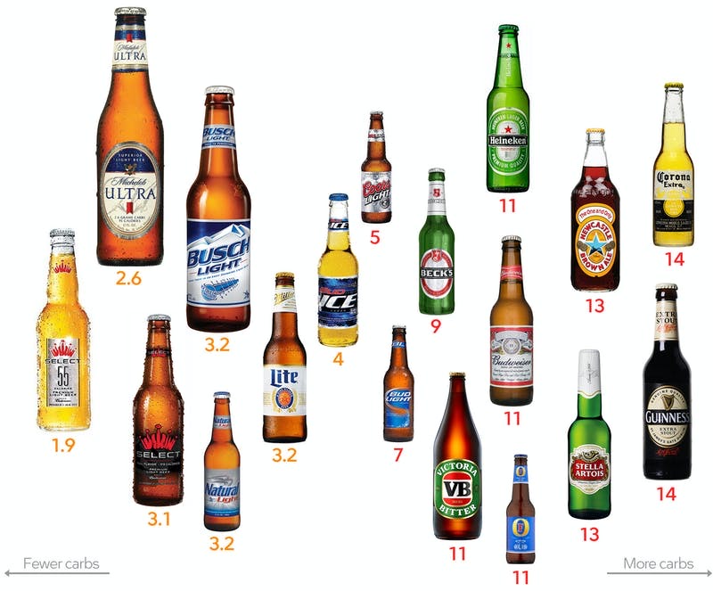 Below you’ll find all the details; the options with fewer carbs and calories are to the left. In general, the lower the carbs in alcohol, the lower the calories, too.