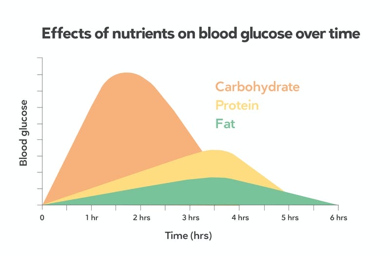 This other graph shows you how different micronutrients such as carbohydrates, protein and fat can raise your blood sugar levels. With carbohydrates you get a big glucose spike, yet protein is a moderate amount and fat is more lower and stable over time.