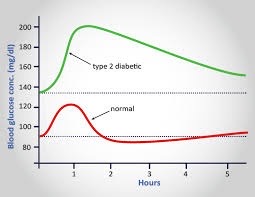 As you can see in the image below blood in someone who doesn’t have diabetes their blood sugars peak at about 1 hour and after 2 hours it returns to normal, as their body is able to adjust and utilise that sugar effectively. However, with someone who has type 2 Diabetes their blood sugars are already high, it then peaks at 1 hour but very slowly drops down to their baseline which can be over 5 or 6 hours later. If you eat more sugary high carb foods on top of this then the level gets higher and higher and it takes longer and longer for your body to try and bring your sugar levels down. So its important to eat foods which will not cause such a high spike in the first place which will allow for your body to utilise that blood sugar more effective leading to better control of your sugar levels.